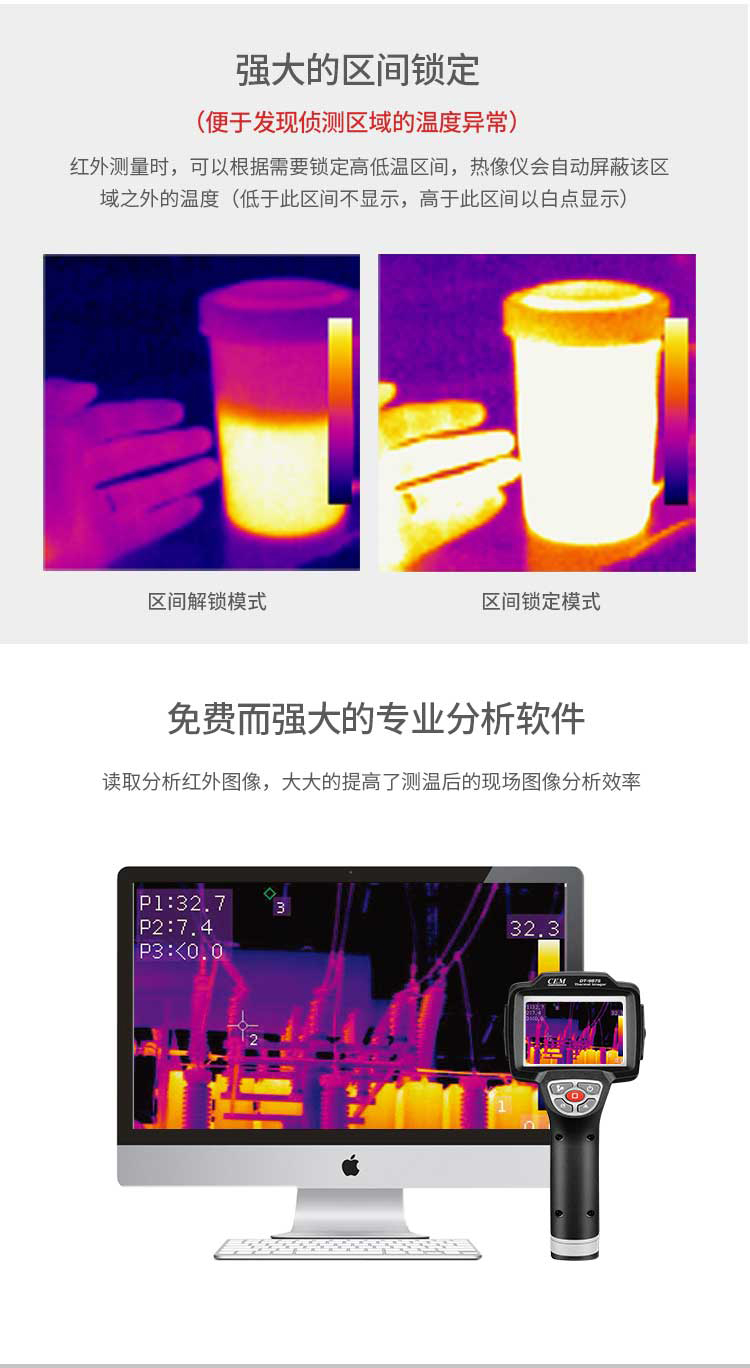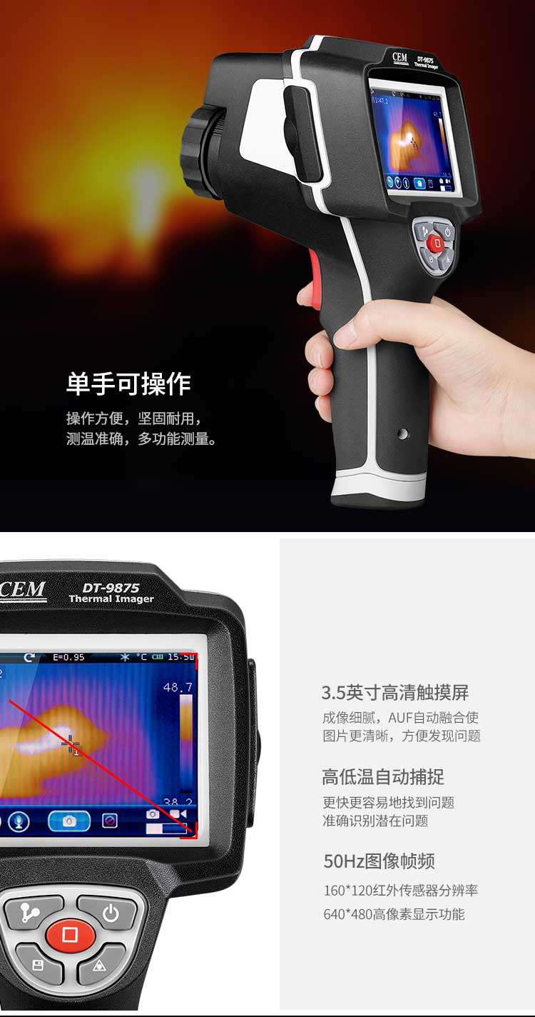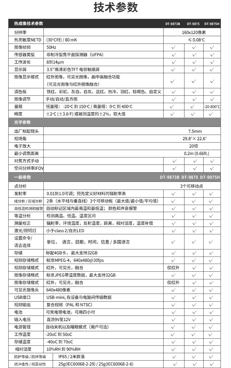 標配鏡頭7.5mm,分辨率160×120,IFOV:3.33mard,視場角29.8×22.6°,熱靈敏度NETD<0.08℃,圖像幀頻50Hz,溫度范圍(-20-150、0-400),可見光分辨率640×480像素