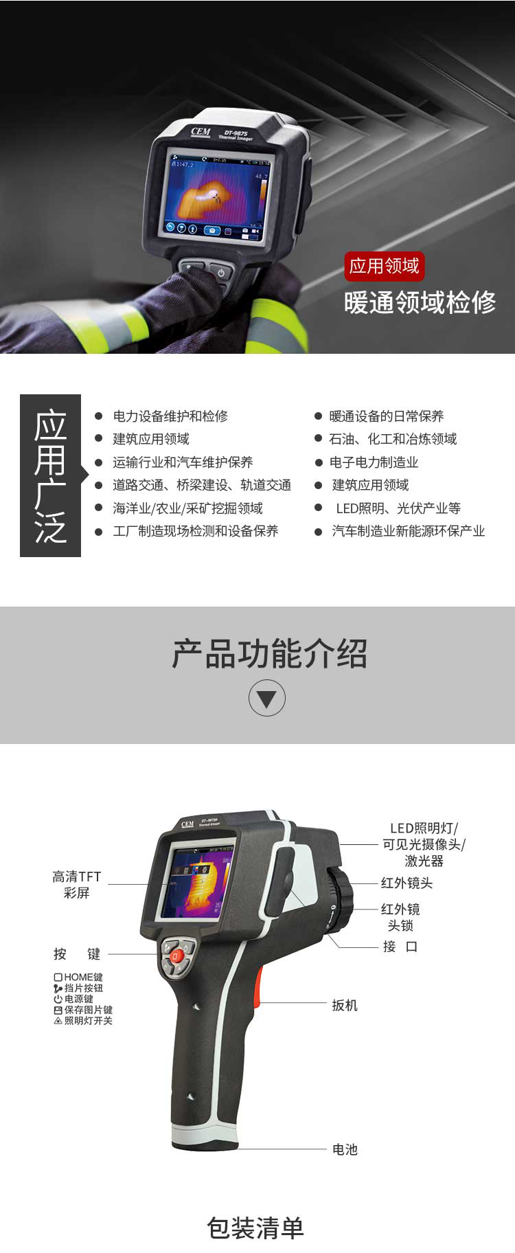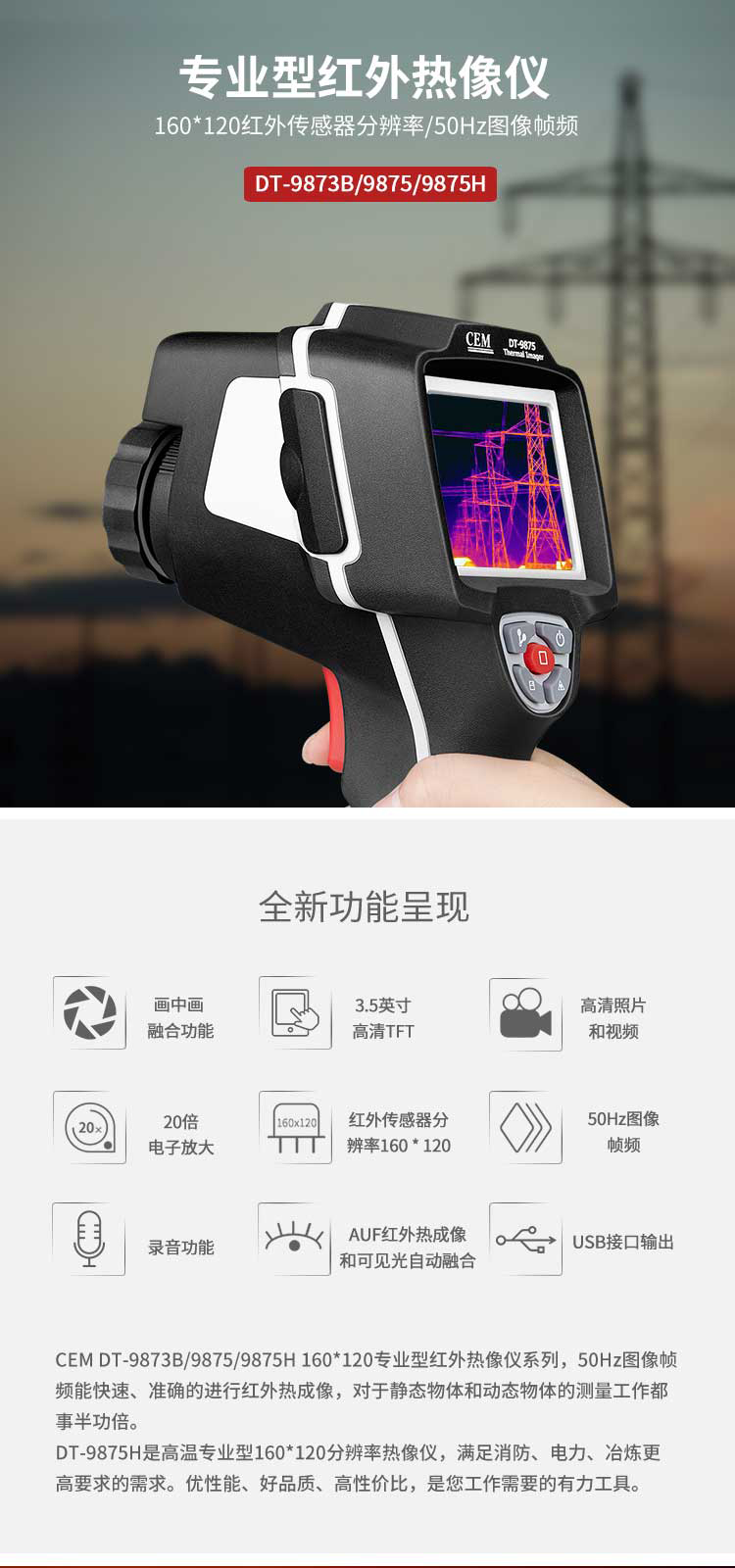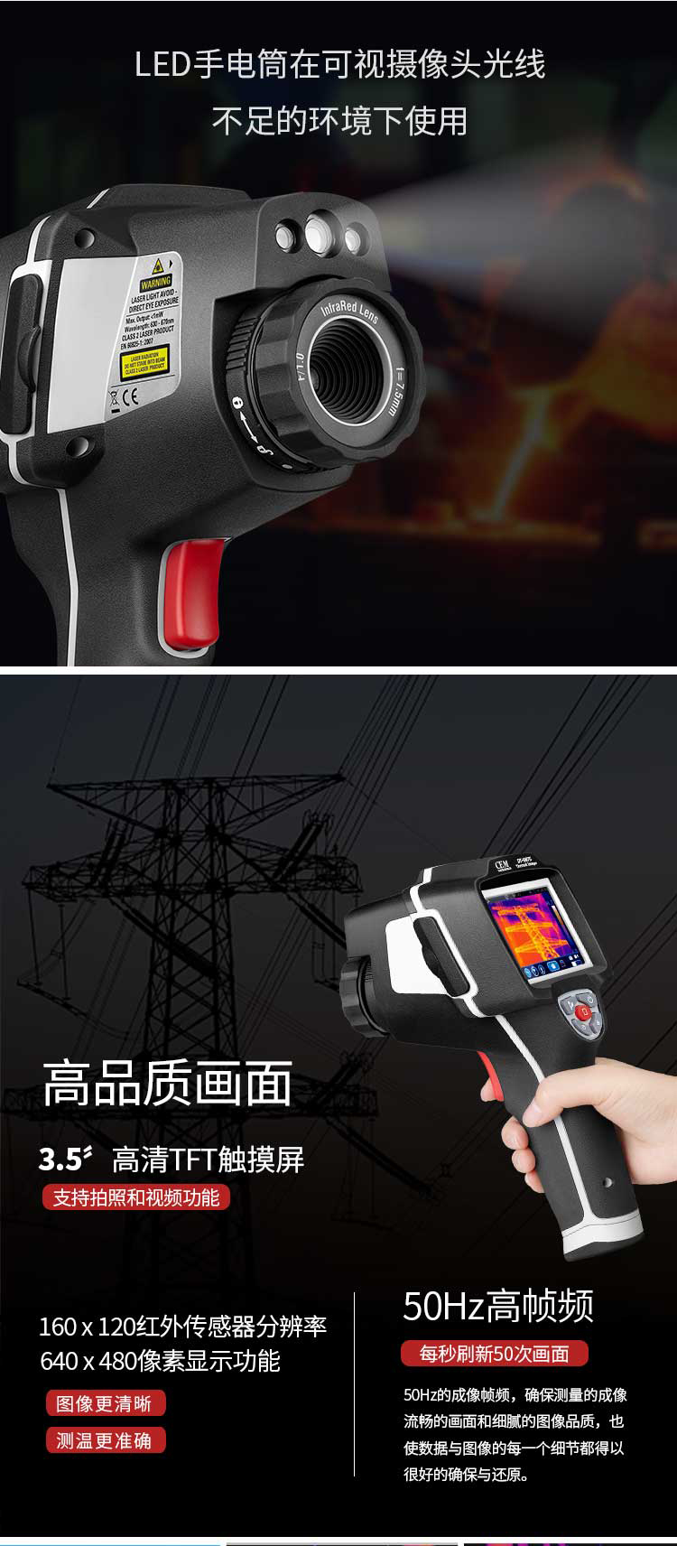 標配鏡頭7.5mm,分辨率160×120,IFOV:3.33mard,視場角29.8×22.6°,熱靈敏度NETD<0.08℃,圖像幀頻50Hz,溫度范圍(-20-150、0-400),可見光分辨率640×480像素
