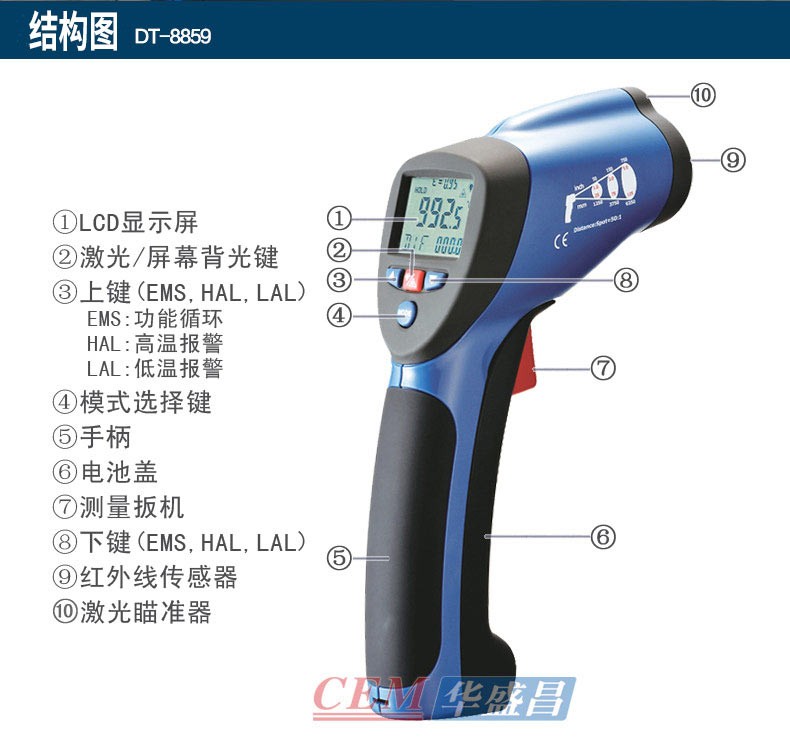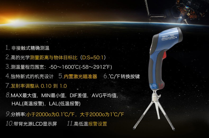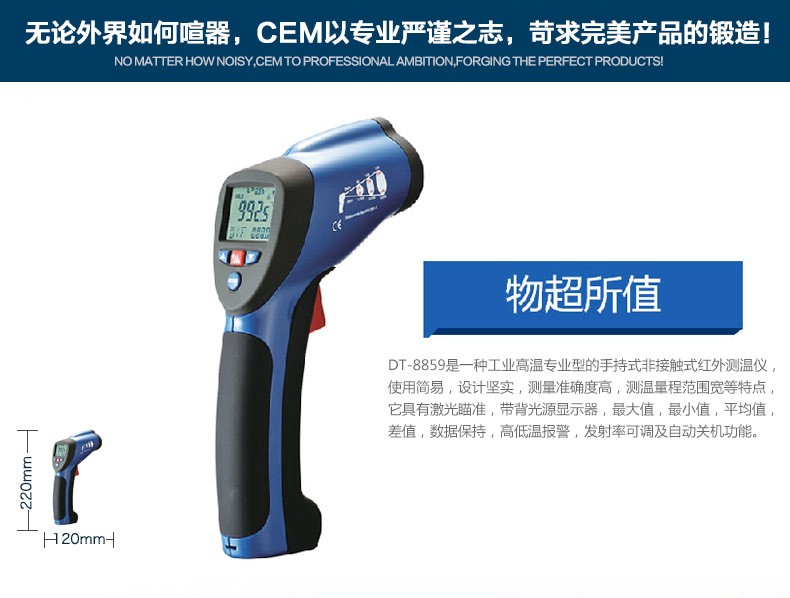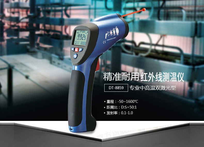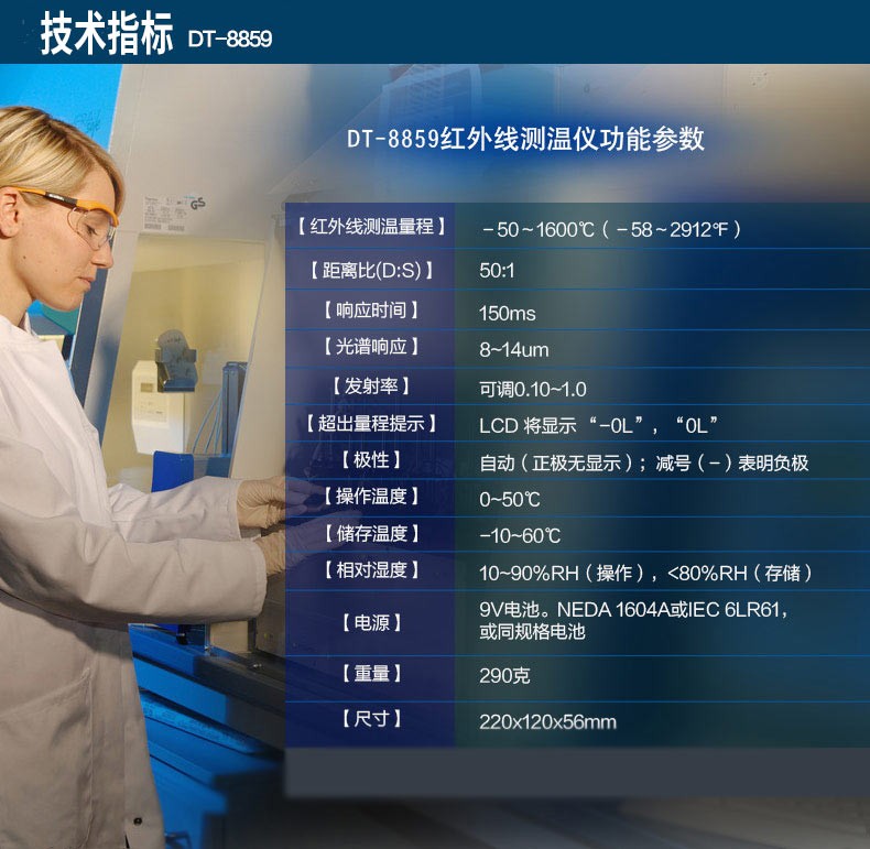 DT-8829紅外線測溫儀一種專業(yè)型的手持式非接觸紅外線測溫儀,使用簡易,設(shè)計堅實,測量準確度高,測溫量程范圍寬等特點。它具有激光瞄準,帶背光源顯示器,最大值,最小值,平均值,差值,數(shù)據(jù)保持,高低溫報警,發(fā)射率可調(diào)及自動關(guān)機功能。該手持式非接觸紅外線測溫儀可用于測量那些不適合使用傳統(tǒng)接觸式測量方法來測量物體的表面溫度(例如移動物體,帶電表面和難以接觸到的物體)。特征:非接觸式精確測溫高的光學測量距離與物體目標比(D:S-16;1/50:1)測溫量程范圍寬獨特新式的機殼設(shè)計內(nèi)置激光瞄準器自動數(shù)值保持℃/F轉(zhuǎn)換按鍵發(fā)射率調(diào)整從0.10 到1.0,(8829固定在0.95)MAX,MIN,DIF,AVG 溫度顯示帶背光源LCD顯示屏自動選擇量程,分辨率為0.1