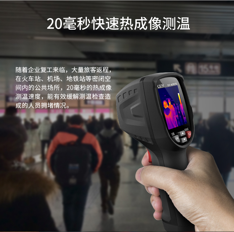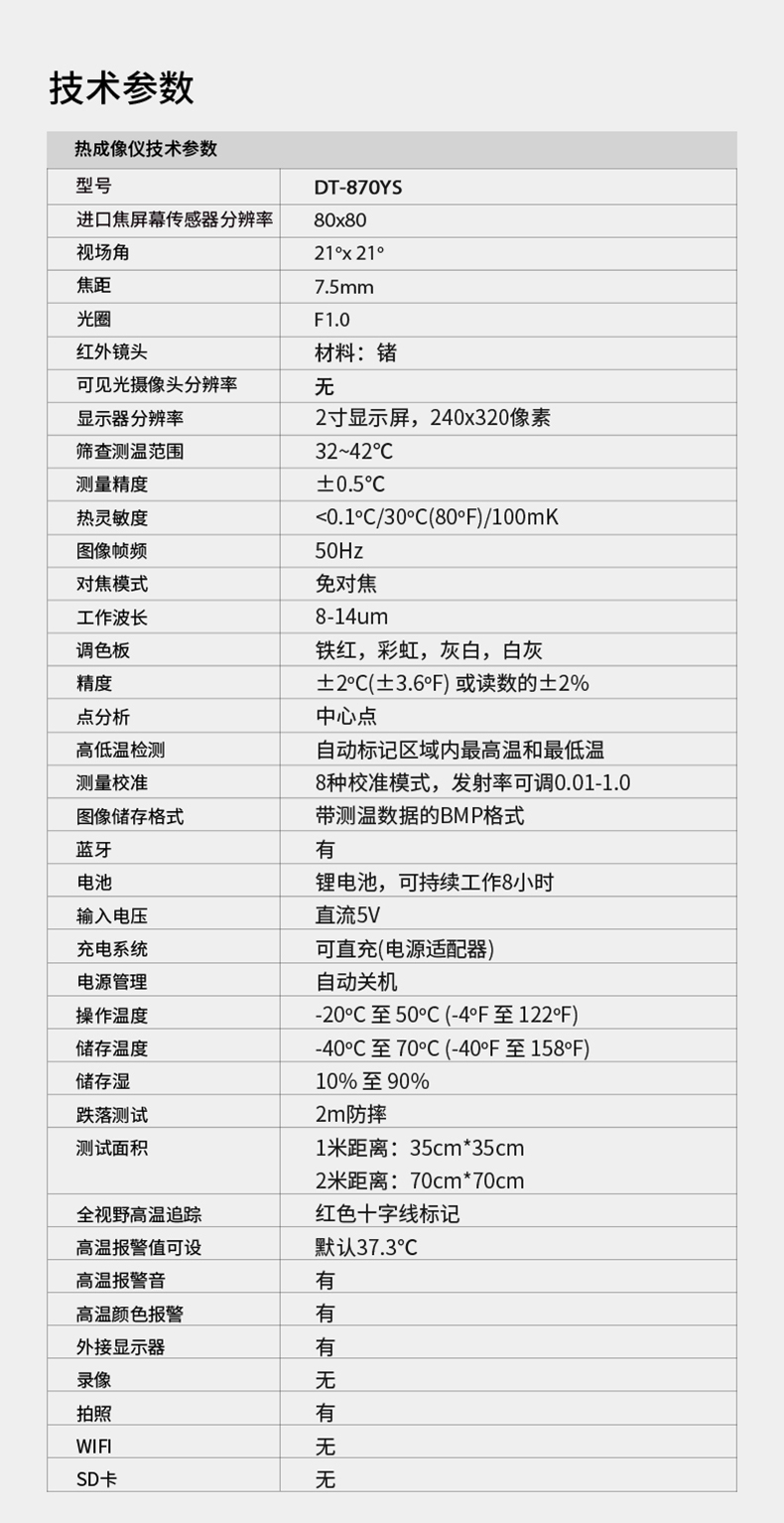 分辨率:80*80、圖像幀頻:50HZ、篩查測溫范圍:32-42℃、DT-8780YS外接10.1英寸PAD大屏,可實現(xiàn)多人同時測溫,AI人臉識別