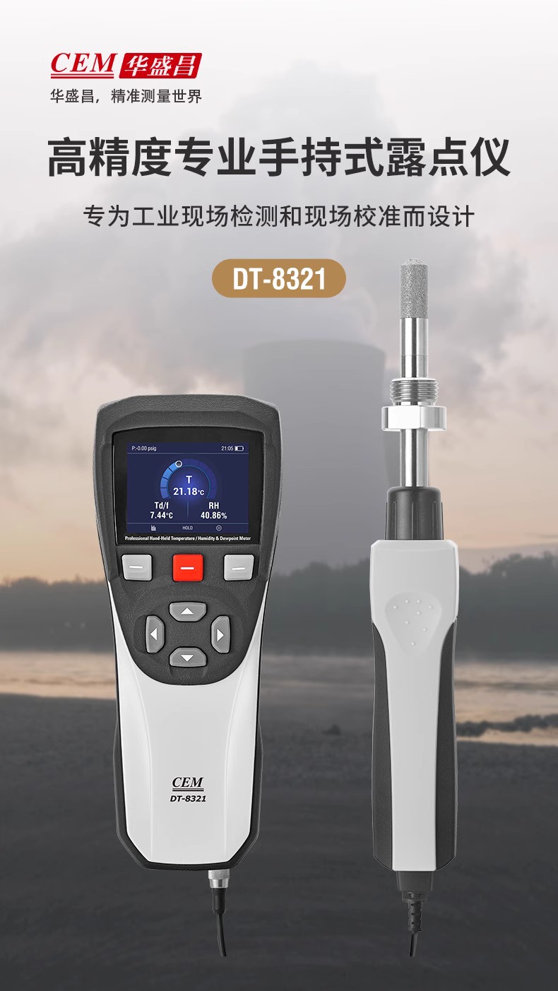 產(chǎn)品概述 CEM DT-8321是CEM華盛昌新設(shè)計(jì)、研發(fā)和制造的一款高精度專業(yè)手持式露點(diǎn)儀,精度高范圍廣,能在較寬的測量范圍內(nèi)準(zhǔn)確測量露點(diǎn)溫度,探頭可直接插入加壓過程中,并快速響應(yīng)測試過程環(huán)境條件,為工業(yè)露點(diǎn)測量應(yīng)用提供準(zhǔn)確快速的測量。產(chǎn)品廣泛應(yīng)用于實(shí)驗(yàn)室、電力電氣、SF6氣體測量、精密制造、化工制藥等領(lǐng)域的大溫度、大壓力范圍內(nèi)的直接過程露點(diǎn)測量。 產(chǎn)品優(yōu)勢 性能穩(wěn)定,維修成本低,可專業(yè)用于工業(yè)現(xiàn)場檢測和戶外校驗(yàn)等場合。 高品質(zhì)傳感器,測量更準(zhǔn)確,適用于低露點(diǎn)測量。測量范圍達(dá)-50至+30°C,低濕度測量<5%RH?!駛鞲衅骺沙惺苣Y(jié),無需擔(dān)心結(jié)露影響測量精度。 傳感器探頭具備凈化功能以及加熱功能,預(yù)熱時(shí)間短,測量結(jié)果更穩(wěn)定。 靈活的數(shù)據(jù)記錄功能,可設(shè)置自動(dòng)記錄間隔,CSV文件可以通過USB傳輸?shù)絇C端。 測量數(shù)據(jù)可一鍵保存,可使用電腦中的Excel軟件查看。 外形堅(jiān)固,緊湊,小巧,外加藍(lán)色彩屏設(shè)計(jì),界面更加直觀簡潔。 可充電設(shè)計(jì),持久續(xù)航更方便。