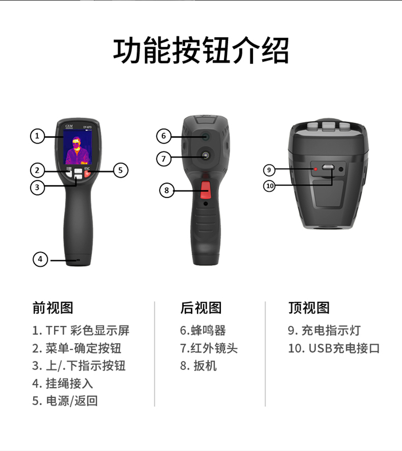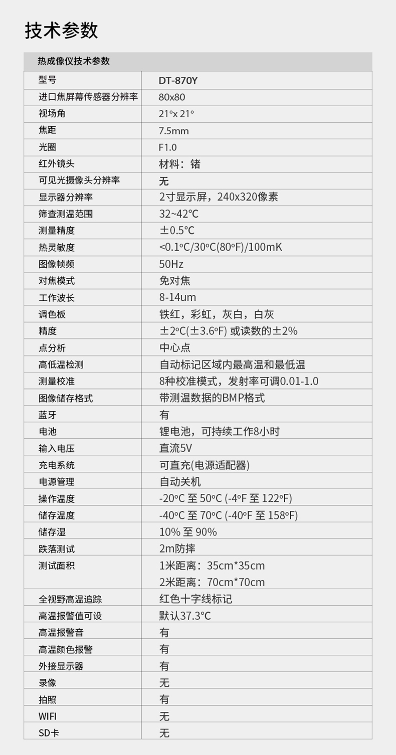 標配鏡頭7.5mm,分辨率80×80,IFOV:4.53mard,視場角21×21°,熱靈敏度NETD<0.1℃,圖像幀頻50Hz,溫度范圍(-20-380),可見光分辨率320×240像素