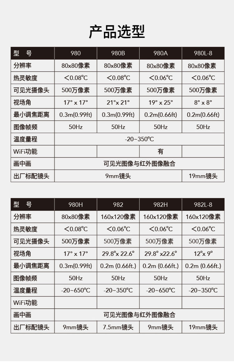 標(biāo)配鏡頭7.5mm,分辨率80×80,IFOV:3.77mard,視場角17×17°,熱靈敏度NETD<0.06℃,圖像幀頻50Hz,溫度范圍(-20-150、0-650),可見光分辨率500萬像素